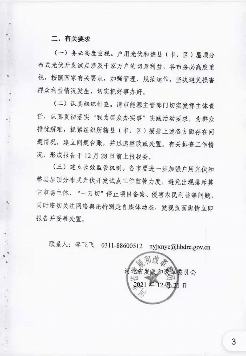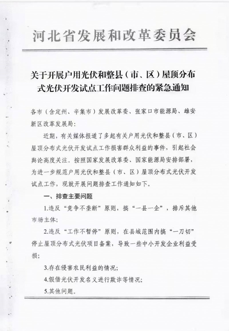 12月21日,河北省發(fā)改委下發(fā)《關(guān)于開展戶用光伏和整縣(市、區(qū))屋頂分布式光伏開發(fā)試點(diǎn)工作問題排查的緊急通知》,文件指出:近期有關(guān)媒體報(bào)道多起有關(guān)戶用光伏和整縣(市、區(qū))屋頂分布式光伏開發(fā)試點(diǎn)工作損害群眾利益的事件,引發(fā)社會(huì)輿論高度關(guān)注。按照國家發(fā)展改革委、國家能源局安排部署,為進(jìn)一步規(guī)范戶用光伏和整縣(市、區(qū))屋頂分布式光伏開發(fā)試點(diǎn)工作,開展問題排查工作。有關(guān)排查工作情況,于12月28日上報(bào)。