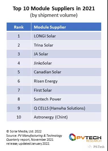 2021年,前10名組件供應(yīng)商的出貨量約為150GW。隆基是當(dāng)之無愧的第一名,在前10名供應(yīng)商中,中國公司再次占據(jù)了8席和前10名中的前6名。