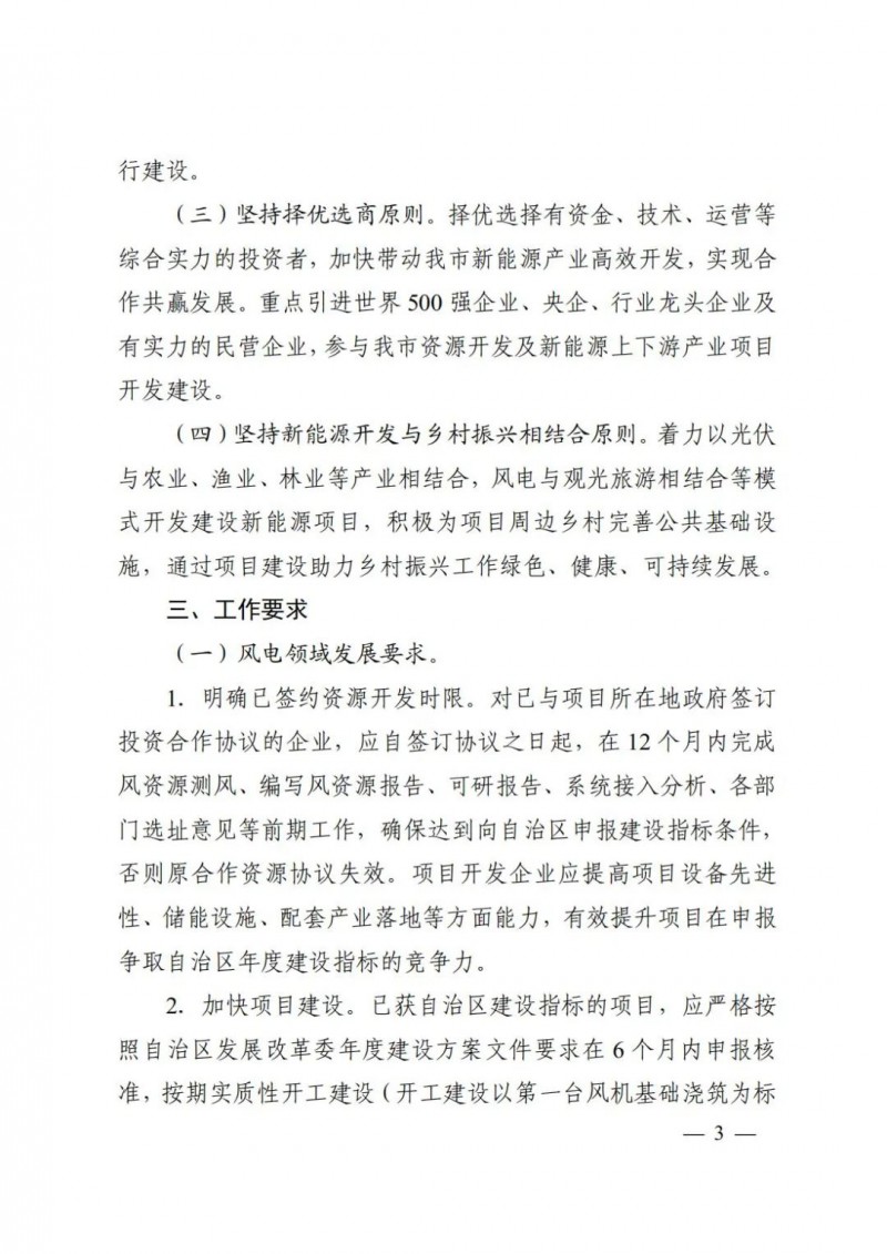 對已獲自治區(qū)建設(shè)指標(biāo)的項目,應(yīng)嚴(yán)格按照自治區(qū)發(fā)展改革委年度建設(shè)方案文件要求按期實質(zhì)性開工建設(shè)、完工和實現(xiàn)并網(wǎng)發(fā)電,否則取消項目建設(shè)權(quán)限。