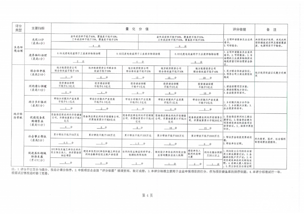 科技創(chuàng)新劃分五個指標(biāo),部分項目可累計得分,主要是氫能、抽水蓄能、光熱、儲能以及科技創(chuàng)新成果應(yīng)用等。生態(tài)環(huán)境治理為三個指標(biāo),最高可得17分,主要是光伏+、光伏治沙以及廢棄物治理。