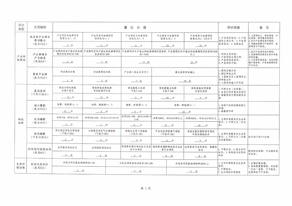 根據(jù)文件,其評分內(nèi)容主要包括企業(yè)投資能力、項目前期深度、荷儲網(wǎng)源、多能互補、產(chǎn)業(yè)協(xié)同帶動、生態(tài)治理以及地方經(jīng)濟貢獻等八大類,各類項目下面細小劃分35個小項。不同類別之間設(shè)置不同分值,以總得分計算排序。