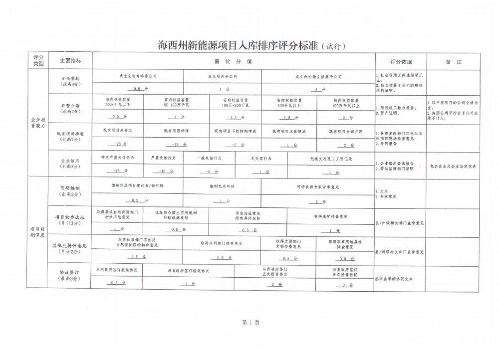1月19日,青海海西州發(fā)改委印發(fā)《新能源項目入庫排序評分標(biāo)準(zhǔn)》,通過八大類35小項的評分類型對新能源項目進行評分排序。