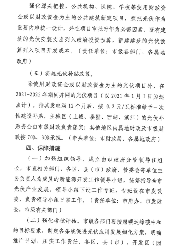 文件提到:除使用財(cái)政資金或以財(cái)政資金為主的光伏項(xiàng)目外,在2021-2025年期間并網(wǎng)的光伏項(xiàng)目(以2021年1月1日為起點(diǎn)計(jì)),待其發(fā)電滿12個(gè)月后,按0.2元/瓦標(biāo)準(zhǔn)給予一次性建設(shè)補(bǔ)貼。主城區(qū)(上城、拱墅、西湖、濱江)的光伏補(bǔ)貼資金由市級(jí)財(cái)政負(fù)責(zé)落實(shí);其他地區(qū)由屬地財(cái)政及市級(jí)財(cái)政按70%、30%承擔(dān)。(牽頭單位:市財(cái)政局、各屬地政府)