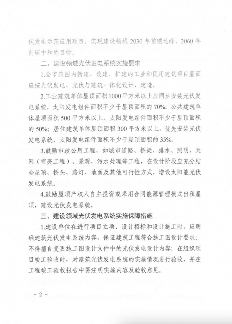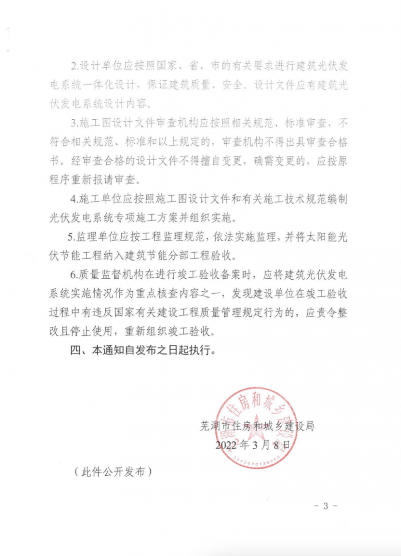 3月10日,安徽蕪湖市住建局發(fā)布關(guān)于加快建設(shè)領(lǐng)域光伏發(fā)電推廣應(yīng)用的通知,通知指出,全市范圍內(nèi)新建、改建、擴(kuò)建的工業(yè)和民用建筑項(xiàng)目屋面應(yīng)按光伏發(fā)電、光伏與建筑一體化設(shè)計(jì)、建造。其中,工業(yè)建筑單體屋頂面積1000平方米以上應(yīng)同步安裝光伏發(fā)電系統(tǒng),太陽發(fā)電組件面積不少于屋頂面積的70%。