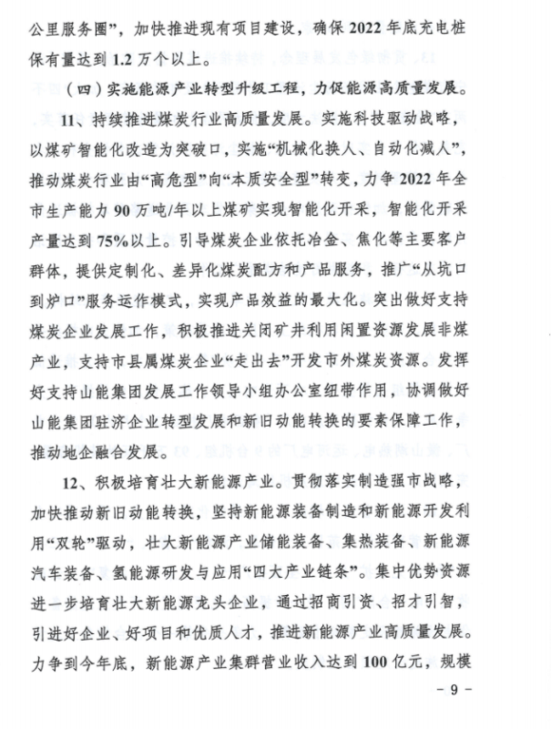 持續(xù)提升新能源和可再生能源開發(fā)利用規(guī)模。落實(shí)市政府《關(guān)于加快新能源和可再生能源高質(zhì)量發(fā)展意見》,統(tǒng)籌優(yōu)化新能源開發(fā)布局,提質(zhì)升級(jí)發(fā)展“光伏+”工程,穩(wěn)步有序發(fā)展生物質(zhì)能,打造新能源多元化利用示范基地。一是突出抓好華能嘉祥梁寶寺150兆瓦“農(nóng)光互補(bǔ)”項(xiàng)目(一期)等8個(gè)納入電網(wǎng)接入和消納意見的新能源項(xiàng)目建設(shè),積極推進(jìn)嘉祥、梁山、魚臺(tái)、鄒城和曲阜整縣分布式光伏規(guī)?;_發(fā)試點(diǎn)工作。全力支持時(shí)代永福濟(jì)寧漁光互補(bǔ)項(xiàng)目和山能集團(tuán)在濟(jì)寧分布式光伏項(xiàng)目建設(shè)。二是大力發(fā)展智慧能源,積極推進(jìn)泗水海螺工業(yè)園區(qū)“零購(gòu)電”源網(wǎng)荷儲(chǔ)一體化智慧示范園區(qū)和魯抗鄒城園區(qū)綠色能源示范項(xiàng)目建設(shè)。三是探索發(fā)展儲(chǔ)能產(chǎn)業(yè),在用戶側(cè)、電源側(cè)和電網(wǎng)側(cè)分類推進(jìn)儲(chǔ)能示范工程建設(shè),力爭(zhēng)2022年建成11萬(wàn)千瓦左右的儲(chǔ)能設(shè)施。
