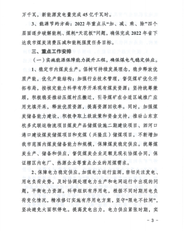 2、能源生產(chǎn)方面:(1)按照現(xiàn)行政策不變的情況下,2022年內(nèi)全市煤炭產(chǎn)量穩(wěn)定在5200萬噸左右;各類發(fā)電企業(yè)完成發(fā)電量490億千瓦時左右;(2)貫徹落實國家及省市煤電裝機相關政策,穩(wěn)步實施“上大壓小”,2022年煤電裝機容量穩(wěn)定在1050萬千瓦左右;(3)立足濟寧市資源稟賦實際,加快新能源開發(fā)利用和消納能力提升,力爭2022年底新能源總裝機實現(xiàn)350萬千瓦,新能源發(fā)電量完成45億千瓦時。