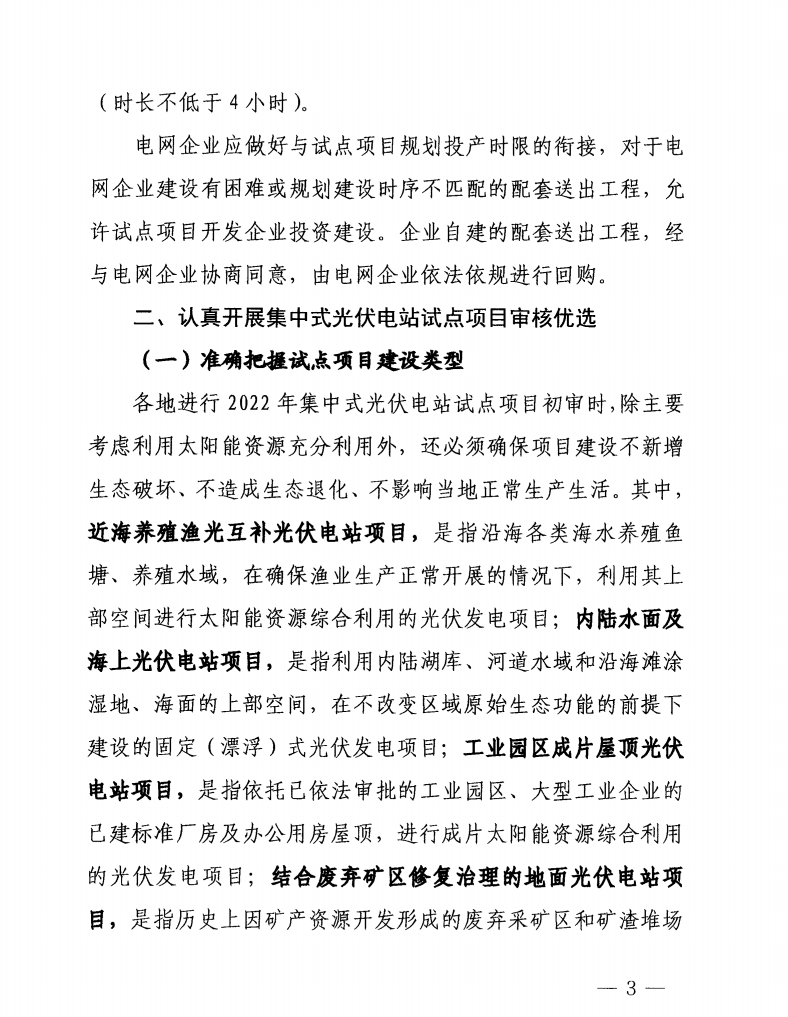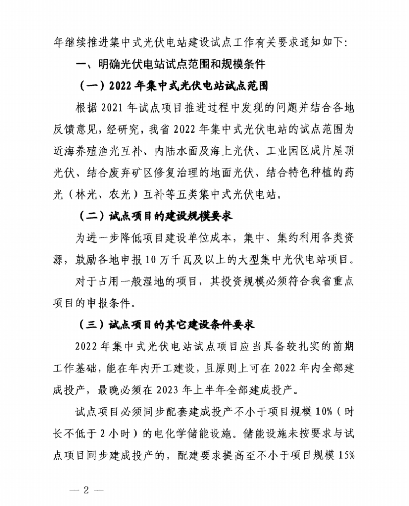 對(duì)2022年集中式光伏電站試點(diǎn)項(xiàng)目提出能在年內(nèi)開(kāi)工建設(shè),且原則上可在2022年內(nèi)全部建成投產(chǎn),最晚必須在2023年上半年全部建成投產(chǎn)的建設(shè)要求。并要求試點(diǎn)項(xiàng)目必須同步配套建成投產(chǎn)不小于項(xiàng)目規(guī)模10%(時(shí)長(zhǎng)不低于2小時(shí))的電化學(xué)儲(chǔ)能設(shè)施。儲(chǔ)能設(shè)施未按要求與試點(diǎn)項(xiàng)目同步建成投產(chǎn)的,配建要求提高至不小于項(xiàng)目規(guī)模15%(時(shí)長(zhǎng)不低于4小時(shí))。