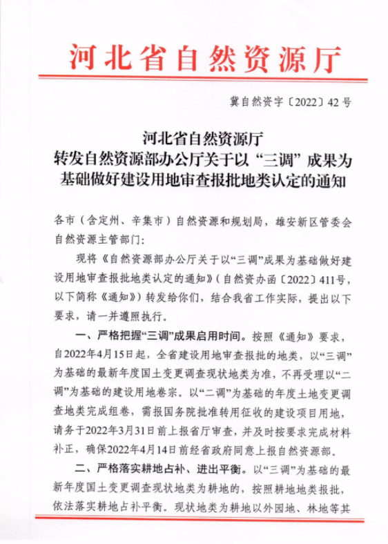 近期,河北省自然資源廳轉(zhuǎn)發(fā)自然資源部辦公廳關(guān)于以“三調(diào)”成果為基礎(chǔ)做好建設(shè)用地審查報(bào)批地類認(rèn)定的通知,按照《通知》要求,自2022年4月15日起,全省建設(shè)用地審查報(bào)批的地類,以“三調(diào)”為基礎(chǔ)的最新年度國(guó)土變更調(diào)查現(xiàn)狀地類為準(zhǔn),不再受理以“二調(diào)”為基礎(chǔ)的建設(shè)用地卷宗。