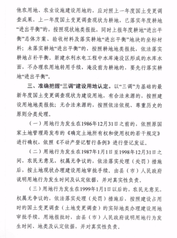 3月9日,自然資源部辦公廳印發(fā)《關(guān)于以"三調(diào)"成果為基礎(chǔ)做好建設(shè)用地審查報(bào)批地類認(rèn)定的通知》,自4月15日起實(shí)施?!锻ㄖ访鞔_了建設(shè)用地審查報(bào)批時(shí)地類認(rèn)定規(guī)則。對(duì)報(bào)批時(shí)現(xiàn)狀為建設(shè)用地的,應(yīng)根據(jù)其來源合法性進(jìn)行分類處理。有合法來源的,按照建設(shè)用地地類報(bào)批;無合法來源的,按照建設(shè)占用時(shí)的國(guó)土變更調(diào)查(土地變更調(diào)查)的實(shí)際地類報(bào)批,地類為耕地的,應(yīng)依法落實(shí)耕地占補(bǔ)平衡。