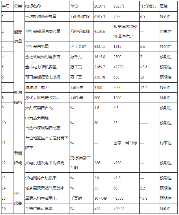 2.結(jié)構(gòu)目標(biāo)。到2025年,全市電力裝機(jī)容量達(dá)到2700萬千瓦以上,其中,可再生能源發(fā)電裝機(jī)容量達(dá)到680萬千瓦以上,清潔能源發(fā)電裝機(jī)占電力總裝機(jī)容量達(dá)到45%以上;原油加工能力達(dá)到5000萬噸/年,液化天然氣接收能力達(dá)到1200萬噸/年;全市能源消費(fèi)結(jié)構(gòu)進(jìn)一步優(yōu)化,天然氣消費(fèi)占比力爭達(dá)到6.5%;電力熱力用煤占全市煤炭消費(fèi)比重達(dá)到85%以上。