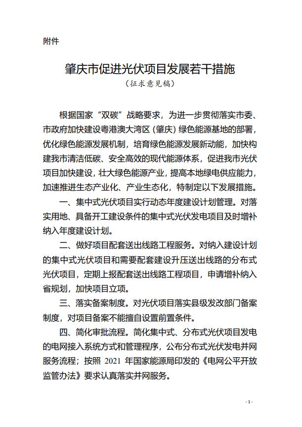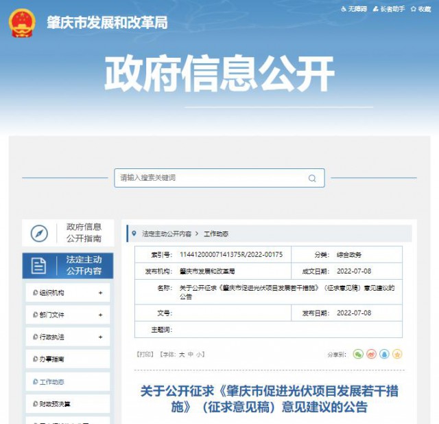 7月8日,廣東省肇慶市發(fā)改局發(fā)布關于公開征求《肇慶市促進光伏項目發(fā)展若干措施》(征求意見稿)意見建議的公告。
