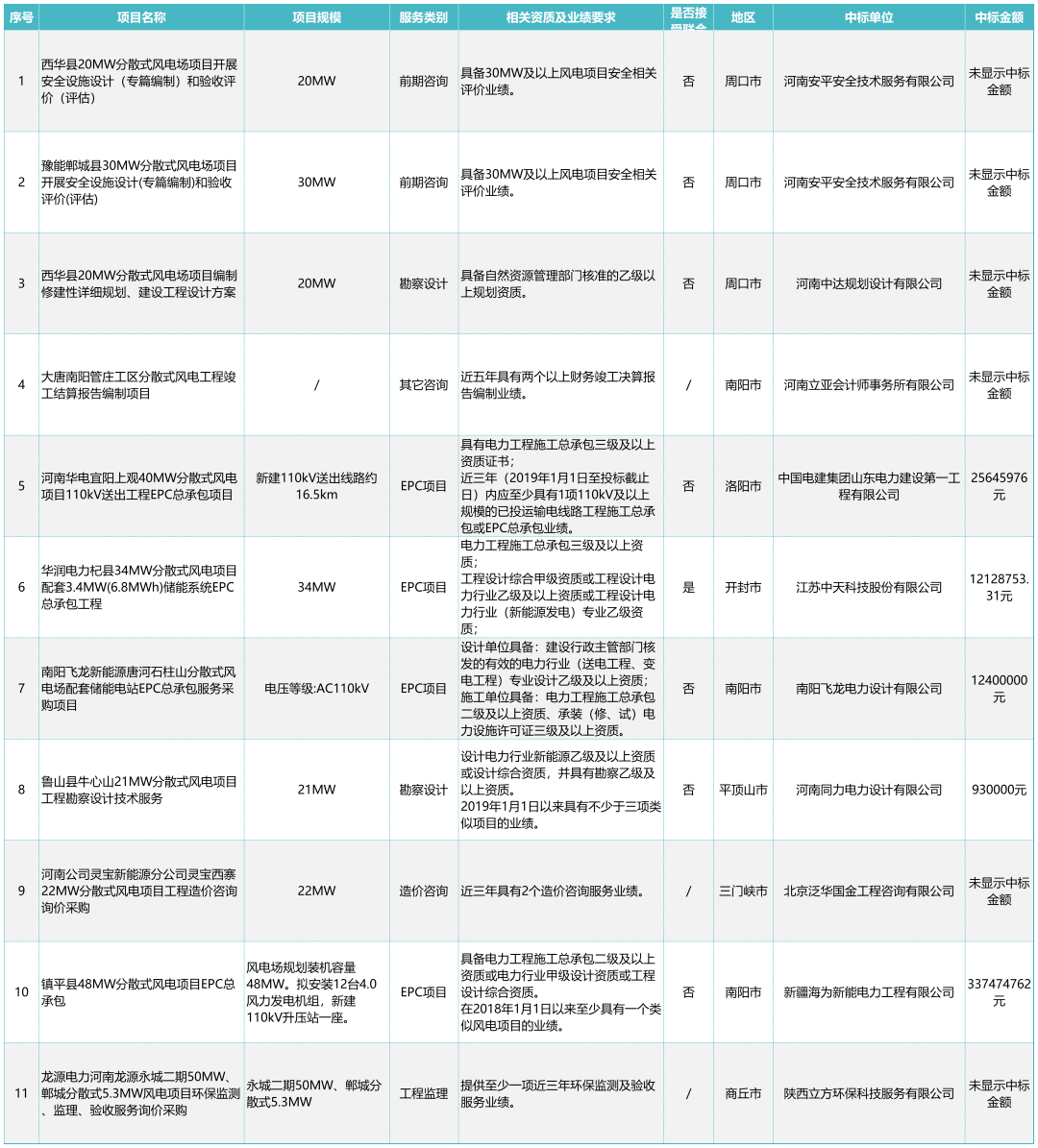 依據(jù)小海帶平臺2022年1月至7月統(tǒng)計數(shù)據(jù)顯示,河南省目前分散式風電項目共11項,服務內(nèi)容涵蓋勘察設計、造價咨詢、工程監(jiān)理等,其中主要為勘察設計與前期咨詢,大部分項目還處于工程進展的前期階段。風電項目占電力項目的比例不足20%,分散式風電項目占風電項目的比例僅22%左右,當前整體規(guī)模并不大。