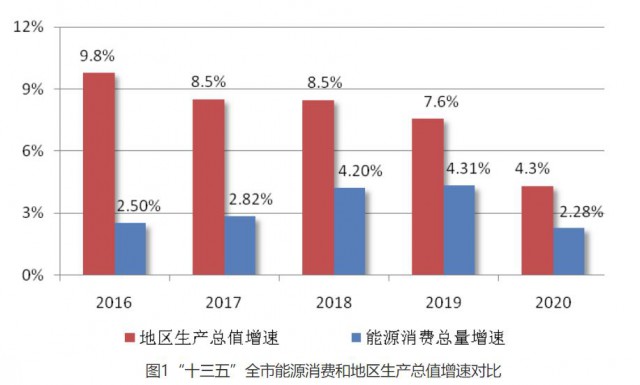 “十三五”期間,全市能源消費總量年均增速低于地區(qū)生產總值年均增速4.5個百分點,低于全社會用電量增速6.26個百分點。2020年,全市地區(qū)生產總值占全省25.97%,但能源消費總量僅占全省16.73%,能源利用日趨合理,能源利用效率全省領先。