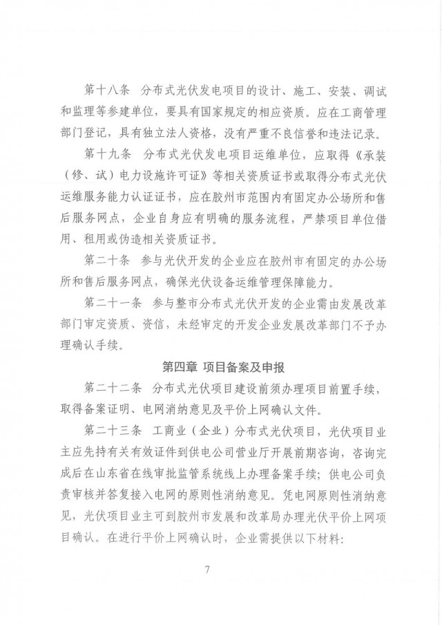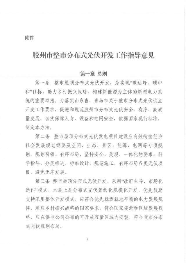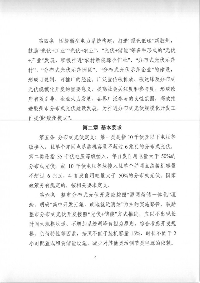 近日,山東膠州市發(fā)改委發(fā)布了《膠州市整市分布式光伏開發(fā)工作指導意見》。文件要求,整市分布式光伏開發(fā)應按照“源網荷儲一體化”理念,明確“集中開發(fā)匯集、就地就近消納”為主的實施路徑。鼓勵整市分布式光伏開發(fā)按照“光伏+儲能”方式推進,應以不出現(xiàn)長時間大規(guī)模反送、不增加系統(tǒng)調峰負擔為原則,綜合考慮開發(fā)規(guī)模、負荷特性等因素,按照不低于裝機容量15%、時長不低于2小時配置或租賃儲能設施,減少對其他靈活調節(jié)類電源的依賴。