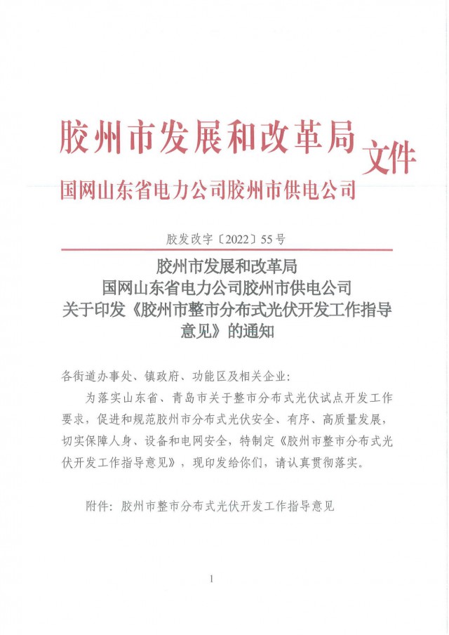 同時圍繞新型電力系統(tǒng)構建,打造“綠色低碳”新膠州,鼓勵“光伏+工業(yè)”“光伏+農業(yè)”、“光伏+儲能”等多種形式的“光伏+產業(yè)”發(fā)展,積板推進“農村新能源合作社”、“分布式光伏示范村”、“分布式光伏示范園區(qū)”、“分布式光伏示范企業(yè)”的建設,形成可復制、可推廣的經驗。高效推進膠州市分布式光伏建設發(fā)展,為推進分布式光伏規(guī)?;_發(fā)工作提供“膠州模式”。