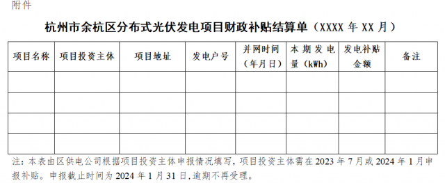 3. 區(qū)供電公司按要求填寫《杭州市余杭區(qū)分布式光伏發(fā)電項目財政補貼結算單》(附件),簽署意見并加蓋公章后報送區(qū)發(fā)改局;經(jīng)區(qū)發(fā)改局審核,區(qū)財政局復核、公示并報區(qū)政府審批同意,向項目投資主體撥付地方財政補貼資金。