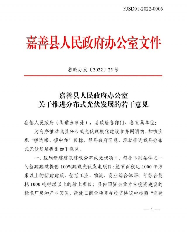 10月14日,嘉善政府網(wǎng)發(fā)布“關(guān)于推進分布式光伏發(fā)展的若干意見”。