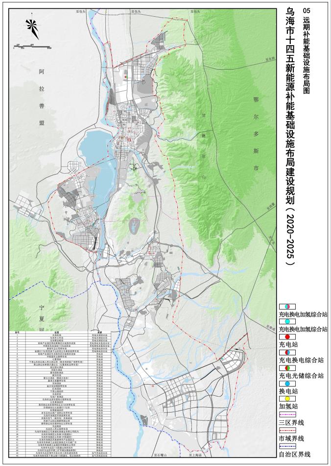 規(guī)劃范圍為全烏海市域范圍,總面積1754平方公里,主要涉及濱河新區(qū)、 海勃灣中心城區(qū)、烏達(dá)中心城區(qū)、海南中心城區(qū)和工業(yè)園區(qū)、物流園區(qū)內(nèi)的充電樁布局、換電站布局、加氫站布局和光伏儲(chǔ)能一體化設(shè)施布局。