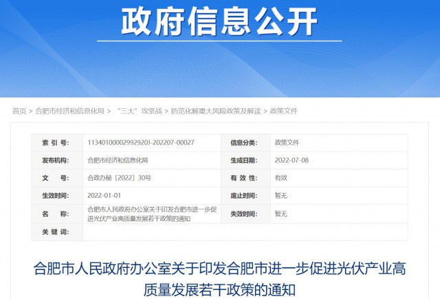 10月18日,合肥市經(jīng)濟(jì)和信息化局、合肥市財政局聯(lián)合發(fā)布“關(guān)于印發(fā)《合肥市進(jìn)一步促進(jìn)光伏產(chǎn)業(yè)高質(zhì)量發(fā)展若干政策實施細(xì)則》的通知”。