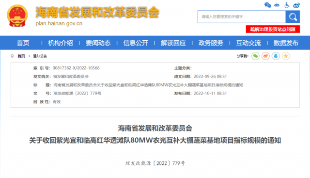 海南省發(fā)展和改革委員會(huì)關(guān)于收回紫光宜和臨高紅華透灘隊(duì)80MW農(nóng)光互補(bǔ)大棚蔬菜基地項(xiàng)目指標(biāo)規(guī)模的通知