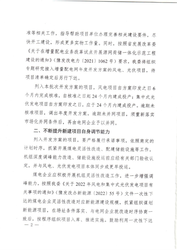 根據(jù)文件,列入本批次開(kāi)發(fā)案的項(xiàng)目,風(fēng)電項(xiàng)目自方案印發(fā)之日6個(gè)月內(nèi)完成核準(zhǔn),自核準(zhǔn)之日起24個(gè)月內(nèi)建成投產(chǎn);集中式光伏發(fā)電項(xiàng)目自方案印發(fā)之日,應(yīng)于24個(gè)月內(nèi)建成投產(chǎn)。逾期未核準(zhǔn)項(xiàng)目,調(diào)出年度開(kāi)發(fā)方案。逾期未并網(wǎng)項(xiàng)目,須重新落實(shí)市場(chǎng)化并網(wǎng)條件后,再由電網(wǎng)企業(yè)予以并網(wǎng)。