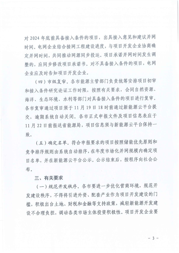 文件明確,規(guī)范開發(fā)秩序。各市要進(jìn)一步優(yōu)化營商環(huán)境,規(guī)范開發(fā)建設(shè)秩序,不得將引進(jìn)外資、配套產(chǎn)業(yè)作為項(xiàng)目開發(fā)建設(shè)的門檻,積極出臺土地、財(cái)稅和金融等支持政策,減輕新能源開發(fā)建設(shè)不合理負(fù)擔(dān),調(diào)動各類市場主體投資積極性。項(xiàng)目開發(fā)企業(yè)要堅(jiān)持實(shí)事求是,充分考慮項(xiàng)目經(jīng)濟(jì)性和可行性,科學(xué)確定配置儲能容量,杜絕盲目競爭、惡意競爭。