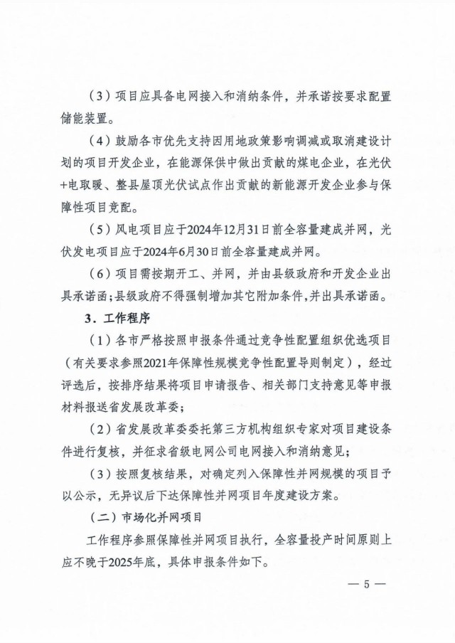 5)保障性規(guī)模項(xiàng)目:風(fēng)電項(xiàng)目應(yīng)于2024年12月31日前全容量建成并網(wǎng),光伏發(fā)電項(xiàng)目應(yīng)于2024年6月30日前全容量建成并網(wǎng)。