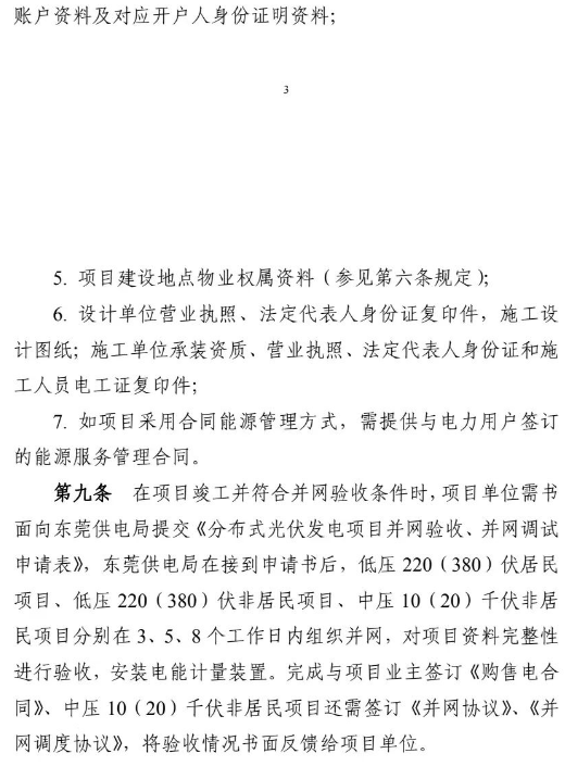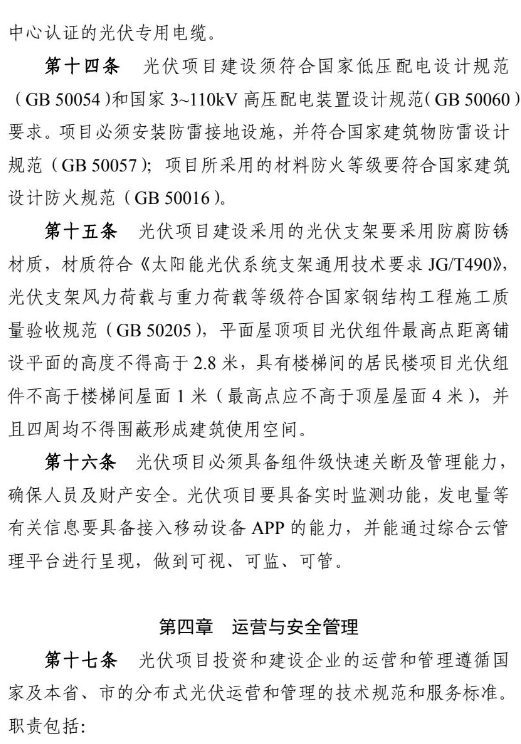 近日,東莞市發(fā)改委印發(fā)《東莞市發(fā)展和改革局分布式光伏發(fā)電項(xiàng)目建設(shè)管理辦法》的通知。在通知中提出:光伏項(xiàng)目建設(shè)采用的光伏支架要采用防腐防銹材質(zhì),材質(zhì)符合《太陽(yáng)能光伏系統(tǒng)支架通用技術(shù)要求JG/T490》,光伏支架風(fēng)力荷載與重力荷載等級(jí)符合國(guó)家鋼結(jié)構(gòu)工程施工質(zhì)量驗(yàn)收規(guī)范(GB 50205),平面屋頂項(xiàng)目光伏組件最高點(diǎn)距離鋪設(shè)平面的高度不得高于2.8米,具有樓梯間的居民樓項(xiàng)目光伏組件不高于樓梯間屋面1米(最高點(diǎn)應(yīng)不高于頂屋屋面4米),并且四周均不得圍蔽形成建筑使用空間。