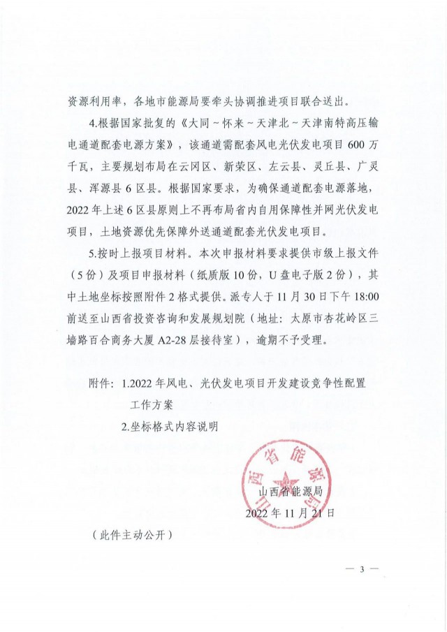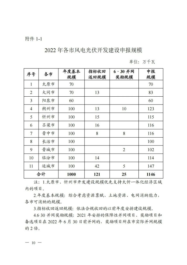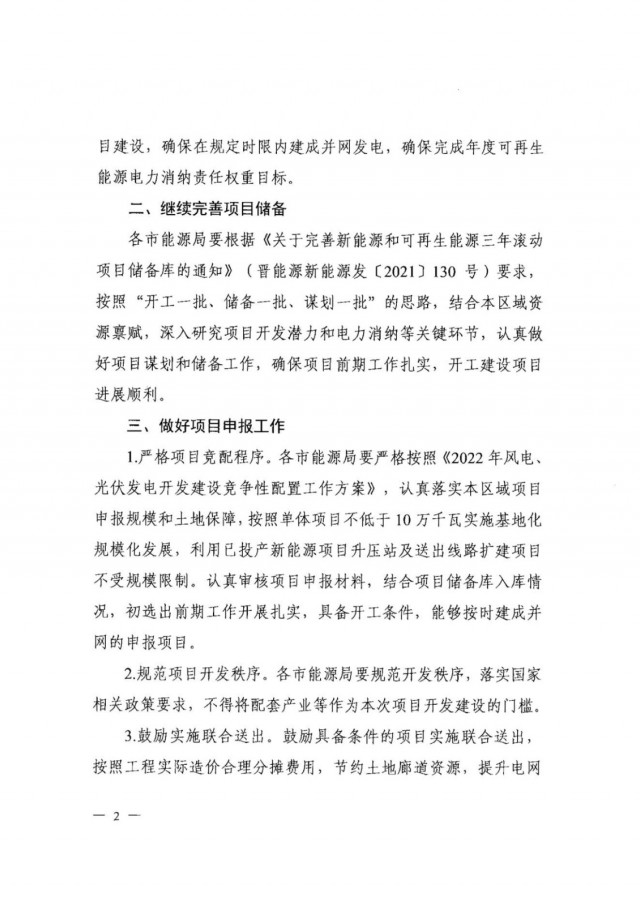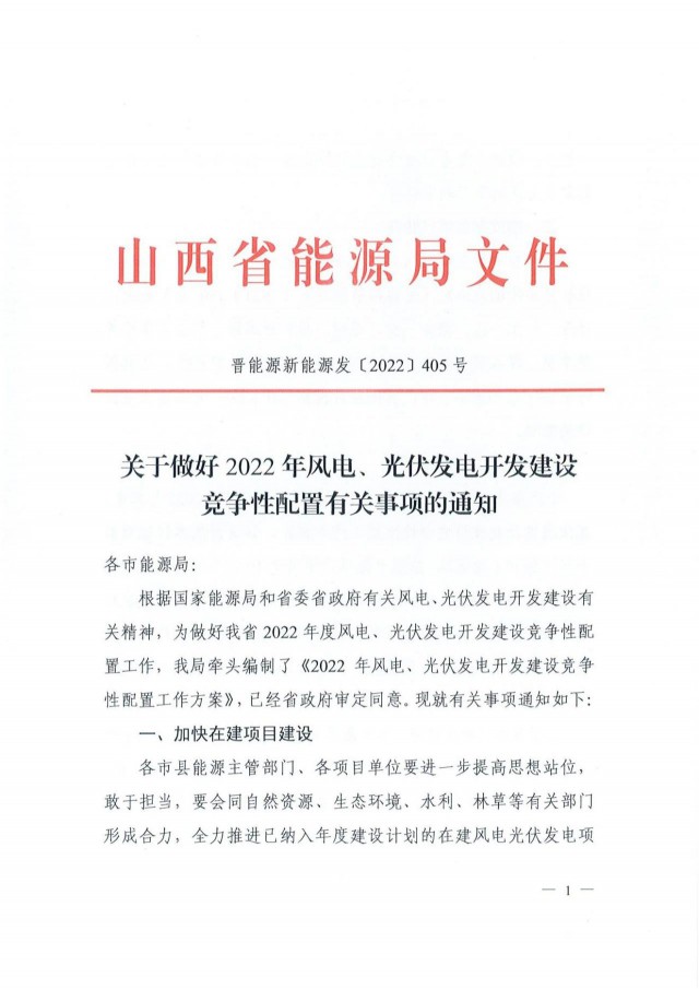 近日,索比光伏網(wǎng)獲悉,山西省能源局印發(fā)《關于做好2022年風電、光伏發(fā)電開發(fā)建設競爭性配置有關事項的通知》(晉能源新能源發(fā)〔2022〕405號),明確安排風電、光伏保障性并網(wǎng)年度規(guī)模1000萬千瓦,獎勵規(guī)模146萬千瓦。