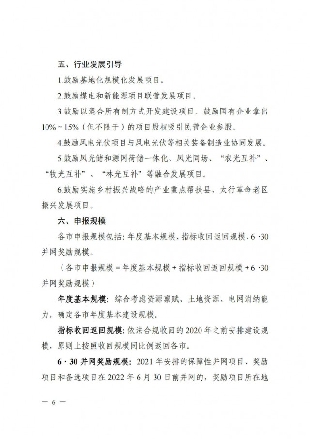 同時,《方案》提出:鼓勵基地化規(guī)?;l(fā)展項目,鼓勵煤電和新能源項目聯(lián)營發(fā)展項目,鼓勵以混合所有制方式開發(fā)建設項目,鼓勵國有企業(yè)拿出10%~ 15%(但不限于)的項目股權吸引民營企業(yè)參股,鼓勵風電光伏項目與風電光伏等相關裝備制造業(yè)協(xié)同發(fā)展,鼓勵風光儲和源網(wǎng)荷儲一體化、風光同場、“農(nóng)光互補”、“牧光互補”、“林光互補”等融合發(fā)展項目,鼓勵實施鄉(xiāng)村振興戰(zhàn)略的產(chǎn)業(yè)重點幫扶縣、太行革命老區(qū)振興發(fā)展項目。