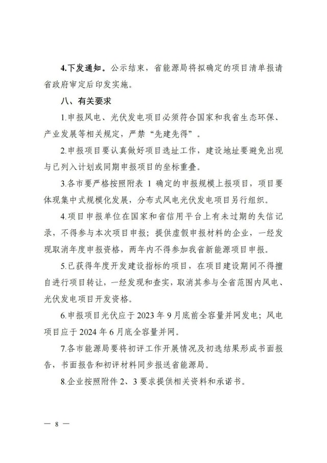 此外,《方案》明確:已獲得年度開發(fā)建設指標的項目,在項目建設期間不得擅自進行項目轉讓,一經(jīng)發(fā)現(xiàn)和查實,取消其參與全省范圍內風電、光伏發(fā)電項目開發(fā)資格。申報項目光伏應于2023年9月底前全容量并網(wǎng)發(fā)電;風電項目應于2024年6月底全容量并網(wǎng)。