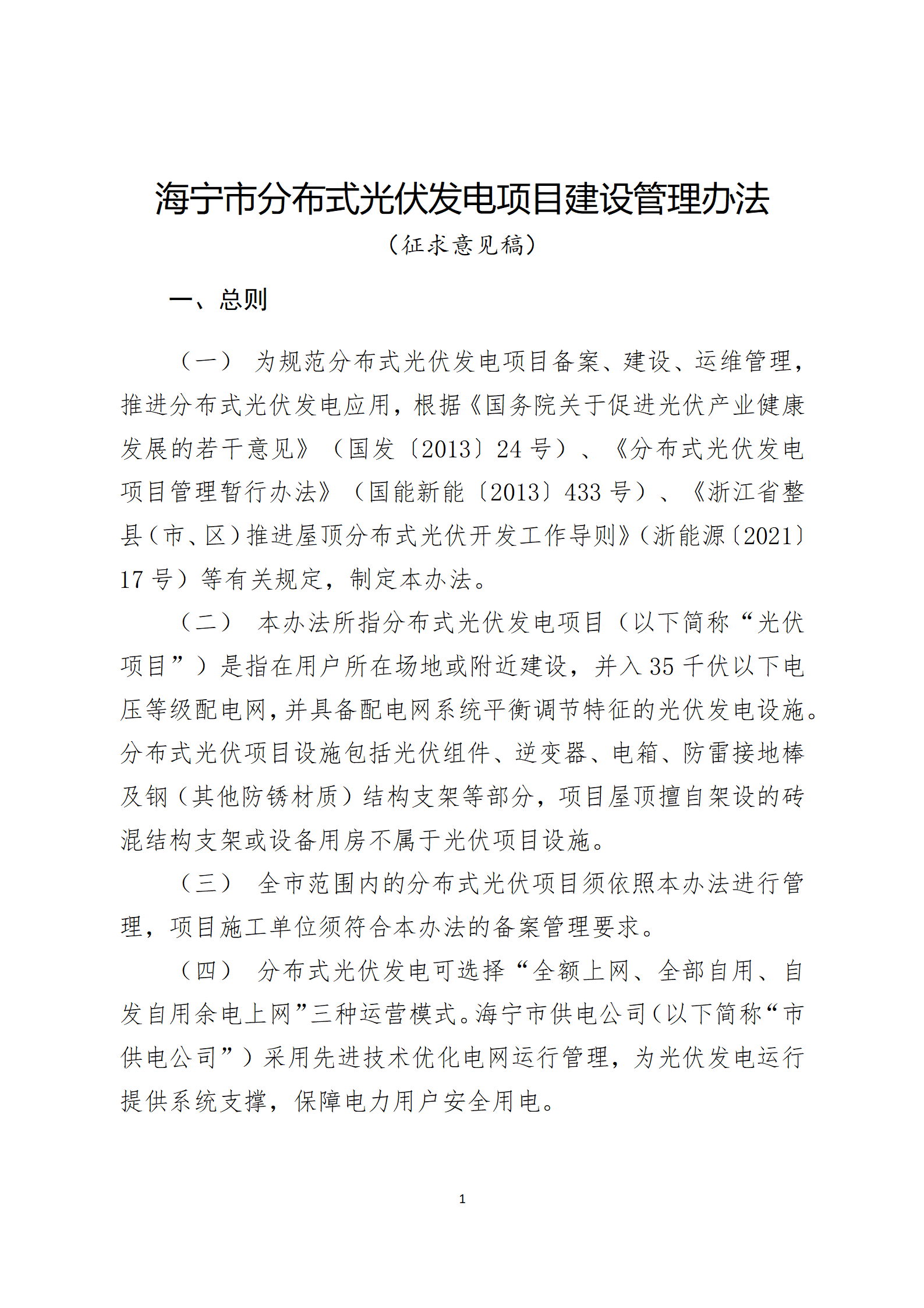 關(guān)于公開征求《海寧市分布式光伏發(fā)電項(xiàng)目建設(shè)管理辦法》(征求意見稿)意見的通知