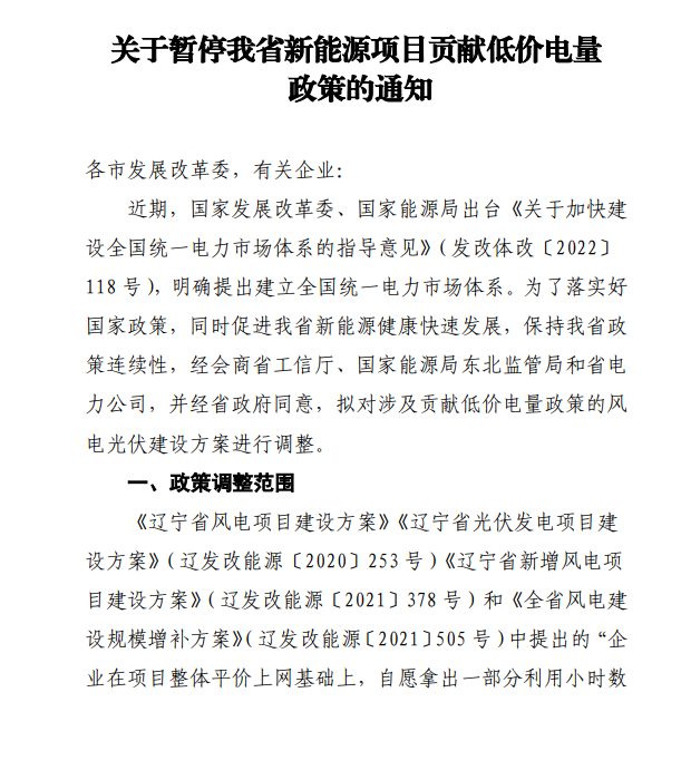 11月28日,遼寧省發(fā)改委發(fā)布通知,對《關(guān)于暫停我省新能源項目貢獻低價電量政策的通知》征求意見。