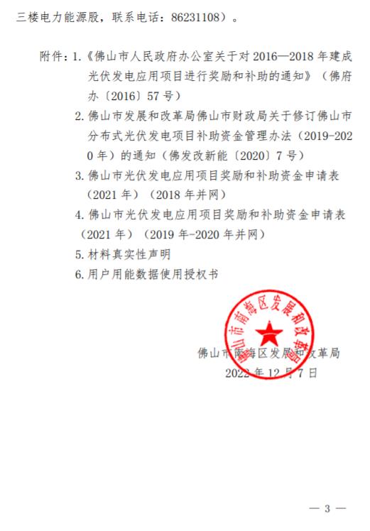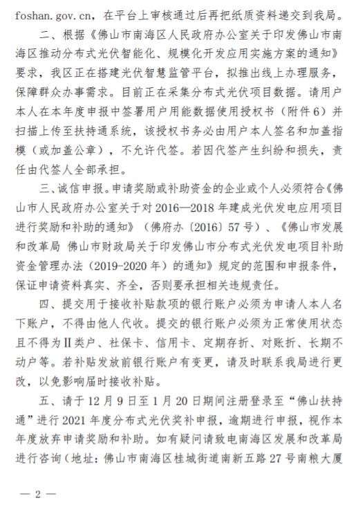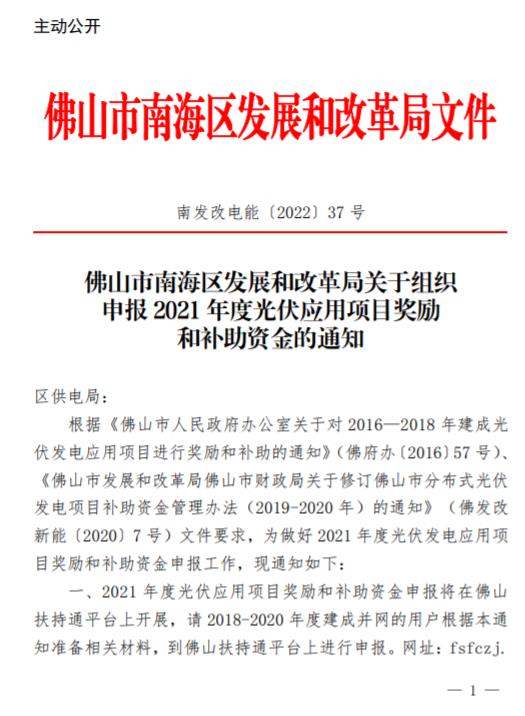 12月8日,廣東省佛山市南海區(qū)發(fā)改局發(fā)布《關(guān)于組織申報(bào)2021年度光伏應(yīng)用項(xiàng)目獎(jiǎng)勵(lì)和補(bǔ)助資金的通知》,2021年度光伏應(yīng)用項(xiàng)目獎(jiǎng)勵(lì)和補(bǔ)助資金申報(bào)將在佛山扶持通平臺(tái)上開(kāi)展,請(qǐng)2018-2020年度建成并網(wǎng)的用戶根據(jù)本通知準(zhǔn)備相關(guān)材料,到佛山扶持通平臺(tái)上進(jìn)行申報(bào)。