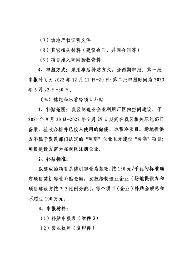 為進(jìn)一步貫徹落實(shí)中央、省關(guān)于振興實(shí)體經(jīng)濟(jì)和市“產(chǎn)業(yè)第一、制造業(yè)優(yōu)先”的決策部署,鼓勵(lì)企業(yè)建設(shè)光伏發(fā)電、儲(chǔ)能和冰蓄冷項(xiàng)目,支持制造業(yè)發(fā)展,有力有序有效做好碳達(dá)峰、碳中和工作,根據(jù)《關(guān)于印發(fā)〈肇慶高新區(qū)節(jié)約用電支持制造業(yè)發(fā)展補(bǔ)貼資金申報(bào)指南〉的通知》(以下簡稱《指南》)等有關(guān)規(guī)定,結(jié)合我區(qū)實(shí)際,現(xiàn)就申報(bào)光伏發(fā)電、儲(chǔ)能和冰蓄冷項(xiàng)目補(bǔ)貼有關(guān)事項(xiàng)進(jìn)一步明確如下: