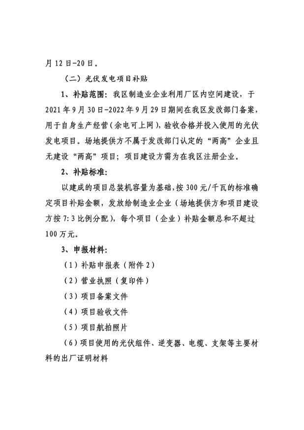 12月10日,廣東省肇慶高新區(qū)發(fā)展規(guī)劃和國土資源局、肇慶高新區(qū)經(jīng)濟(jì)貿(mào)易和科技局發(fā)布《關(guān)于進(jìn)一步明確申報(bào)光伏發(fā)電、儲(chǔ)能和冰蓄冷項(xiàng)目補(bǔ)貼有關(guān)事項(xiàng)的通知》,《通知》中提到:我區(qū)制造業(yè)企業(yè)利用廠區(qū)內(nèi)空間建設(shè),于2021年9月30日-2022年9月29日期間在我區(qū)發(fā)改部門備案,用于自身生產(chǎn)經(jīng)營(余電可上網(wǎng)),驗(yàn)收合格并投入使用的光伏發(fā)電項(xiàng)目。