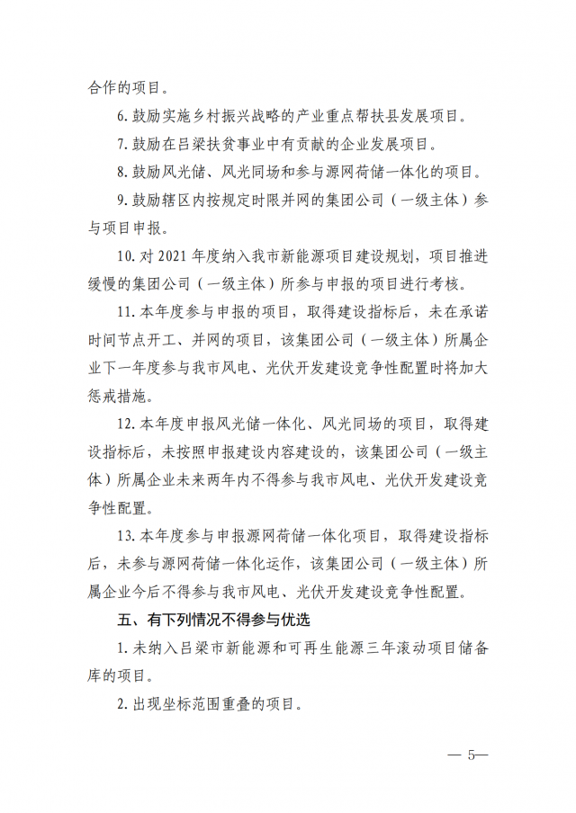 鼓勵風光儲、風光同場和參與源網荷儲一體化的項目。對2021年度納入我市新能源項目建設規(guī)劃,項目推進緩慢的集團公司(一級主體)所參與申報的項目進行考核。
