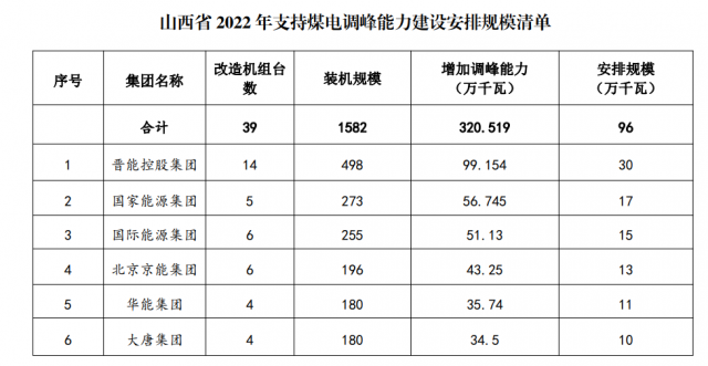 在煤電調峰安排清單中,主要企業(yè)為晉能、國家能源集團、山西國際、京能、華能、大唐等6家央國企,增加調峰能力3.2GW,安排新能源規(guī)模0.96GW。