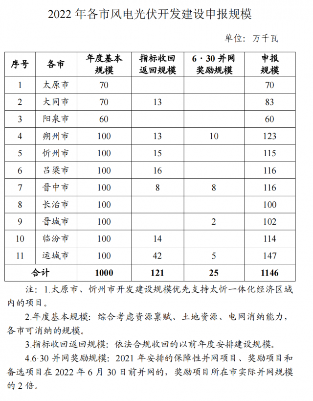 《通知》稱,工作目標為,安排風電、光伏保障性并網年度規(guī)模1000萬千瓦,獎勵規(guī)模146萬千瓦。根據該通知,2022年呂梁市年度風、光規(guī)模共計116萬千瓦。