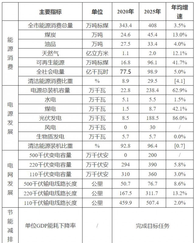 ——能源安全保障目標(biāo)。到2025年,電力裝機(jī)容量達(dá)238.4萬(wàn)千瓦,清潔能源裝機(jī)容量達(dá)229.7萬(wàn)千瓦,占電力總裝機(jī)容量的96.4%;新增110千伏以上輸電線(xiàn)路210公里以上,新增變電容量346萬(wàn)千伏安;完善城市天然氣管網(wǎng)建設(shè),新建江南門(mén)站、高中壓調(diào)壓站2座,新建次高壓管網(wǎng)16公里、中壓管網(wǎng)370公里以上。
