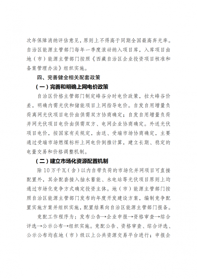 妥善解決光伏棄光限電問題 推進(jìn)可再生能源利用示范區(qū)建設(shè),提高電能在終端用能中 的比例,加快新型儲(chǔ)能建設(shè),深度挖掘調(diào)度潛力。加強(qiáng)藏電外送力度,擴(kuò)大區(qū)外市場(chǎng)消納能力。推進(jìn)存量和新增光伏電站配置儲(chǔ)能、電網(wǎng)側(cè)儲(chǔ)能建設(shè),積極協(xié)調(diào)電網(wǎng)企業(yè)、金融機(jī)構(gòu)等部門,給予優(yōu)先調(diào)度、綠色金融等激勵(lì)政策,有效緩解全區(qū)棄光和局部限電的矛盾。