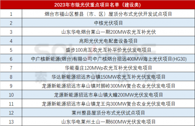 1月28日,煙臺市發(fā)展改革委印發(fā)2023年市級重點項目名單,市級重點項目總量537個、總投資2.2萬億、年度計劃投資2625億元,整體質量規(guī)模再創(chuàng)歷史新高。其中光伏項目13個,規(guī)模合計2.37GW。