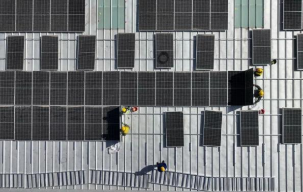 3月16日,工人在唐山市蘆臺(tái)經(jīng)濟(jì)開(kāi)發(fā)區(qū)一家企業(yè)廠房屋頂上安裝太陽(yáng)能光伏發(fā)電板(無(wú)人機(jī)照片)。