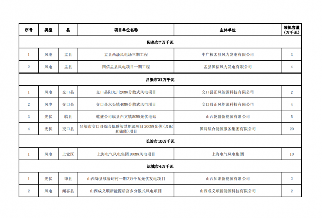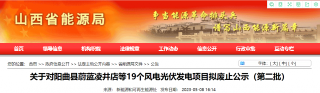 為加快推進(jìn)新能源“十四五”規(guī)劃建設(shè)進(jìn)度,實(shí)現(xiàn)我省新能源產(chǎn)業(yè)高質(zhì)量發(fā)展,我局組織各市能源局對(duì)2021年及之前項(xiàng)目單位投資不積極、確定無(wú)法建設(shè)的風(fēng)電光伏發(fā)電項(xiàng)目進(jìn)行了梳理。相關(guān)地市上報(bào)擬廢止項(xiàng)目清單,經(jīng)我局匯總,擬將陽(yáng)曲縣蔚藍(lán)凌井店等19個(gè)總規(guī)模100.8萬(wàn)千瓦風(fēng)電光伏發(fā)電項(xiàng)目予以廢止,現(xiàn)予公示。相關(guān)企業(yè)如有異議,請(qǐng)向相關(guān)市能源局提出書(shū)面意見(jiàn),并在公示期(5個(gè)工作日)內(nèi),由市能源局上報(bào)省能源局。