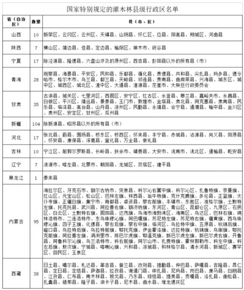 事實上,在今年4月自然資源部、國家林業(yè)和草原局聯(lián)合印發(fā)的《關(guān)于以第三次全國國土調(diào)查成果為基礎(chǔ)明確林地管理邊界規(guī)范林地管理的通知》中已經(jīng)明確表示,灌木林標準是指分布在年均降水量400毫米以下的極干旱、干旱、半干旱地區(qū),不包括喬木分布(垂直分布)上限以上地域的灌木林,并給出了涉及的縣級行政區(qū)名單。