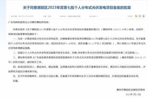 日前,惠陽區(qū)發(fā)展改革局發(fā)布《關于同意惠陽區(qū)2023年度第七批個人分布式光伏發(fā)電項目備案的批復》。文件顯示,為進一步推進惠陽區(qū)區(qū)分布式光伏發(fā)電應用,同意備案你單位報來的惠陽區(qū)2023年度第七批個人分布式光伏發(fā)電項目。本次備案的個人住宅分布式光伏發(fā)電項目共10項,項目投資合計91.00萬元,裝機容量182.23千瓦,納入惠陽區(qū)2023年度分布式光伏發(fā)電新增建設規(guī)模。