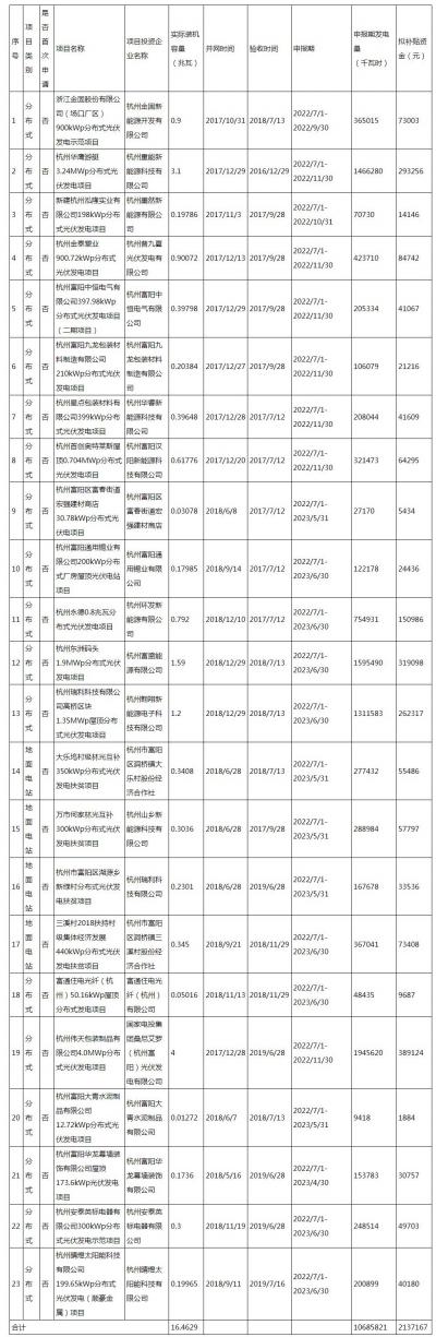 根據(jù)區(qū)經(jīng)濟(jì)和信息化局、區(qū)財(cái)政局《關(guān)于太陽(yáng)能光伏發(fā)電資助的實(shí)施細(xì)則》(富經(jīng)信財(cái)〔2018〕10號(hào),富財(cái)企〔2018〕428號(hào)),《杭州市富陽(yáng)區(qū)人民政府關(guān)于深入實(shí)施高新工業(yè)強(qiáng)區(qū)戰(zhàn)略的若干意見(試行)》(富政〔2018〕4號(hào))及區(qū)政府文件處理單2020年第501號(hào)之規(guī)定,我區(qū)組織開展2023年富陽(yáng)區(qū)非居民光伏發(fā)電項(xiàng)目區(qū)級(jí)補(bǔ)貼兌現(xiàn)工作。經(jīng)區(qū)經(jīng)信局會(huì)同區(qū)財(cái)政局、區(qū)供電公司等相關(guān)部門審核,我區(qū)23家企業(yè)的23個(gè)項(xiàng)目符合補(bǔ)貼條件,擬補(bǔ)貼資金2137167元,詳見附表?,F(xiàn)予以公示,歡迎社會(huì)各界進(jìn)行監(jiān)督。