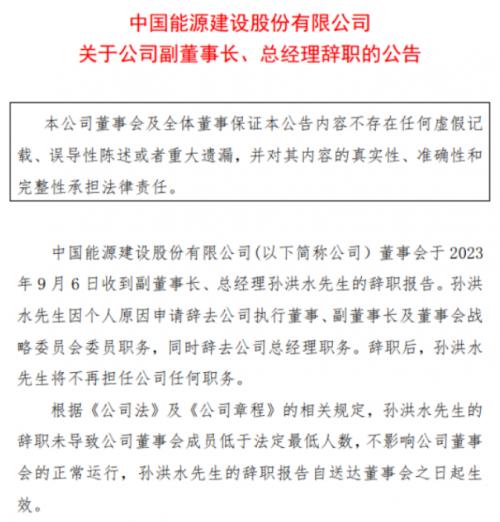2023年9月6日,中國能建公告,孫洪水辭職,將不再擔任公司任何職務(wù)。