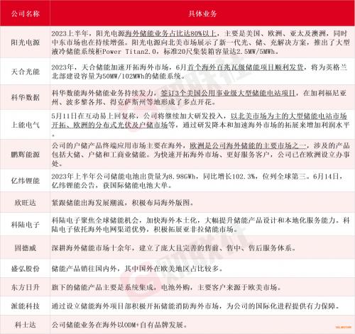業(yè)內(nèi)人士表示,隨著2023年美國光伏裝機重新恢復(fù)增長及ITC補貼力度的加大,預(yù)計美國儲能需求將恢復(fù)翻倍以上的增速。對此,不少儲能企業(yè)紛紛加速“出海”,以全面進軍海外市場為主要目標(biāo)。據(jù)財聯(lián)社不完全整理,在海外有布局儲能相關(guān)業(yè)務(wù)的上市公司主要為陽光電源、天合光能、科華數(shù)據(jù)、上能電氣、鵬輝能源、億緯鋰能、欣旺達、科陸電子、固德威、盛弘股份、東方日升、派能科技、科士達等,具體情況如下: