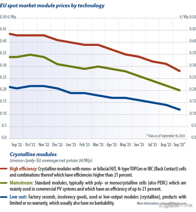 值得注意的是,歐洲的光伏組件高庫存導(dǎo)致的降價也有大量PERC組件面臨淘汰的問題。根據(jù)《PV Magazine》的說法,目前的庫存中有大量比例的PERC組件。在N型技術(shù)越來越普及、價格越來越低的情況下,PERC組件的銷售也遭遇了很大的困難。因此降低價格是一種意料之內(nèi)的清庫存方式。